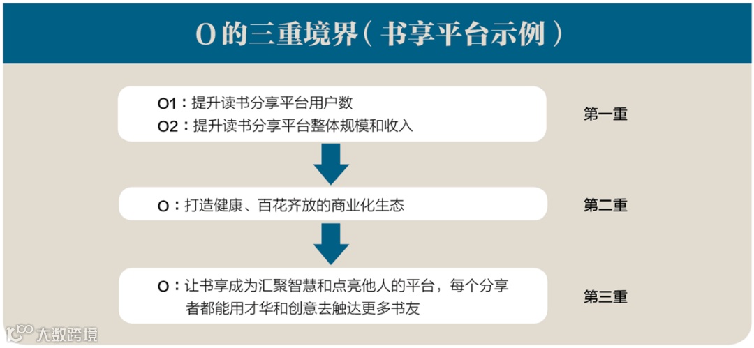 举例来说,某团队构建了一个读书分享平台“书享”,用户可以把他们的读书心得分享到“书享”上,去启发更多的书友,让知识形成二次生产力。于是,在某一季度,团队负责人写下了下面两个O。