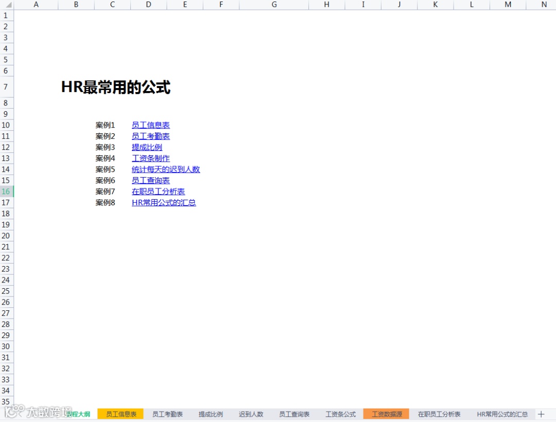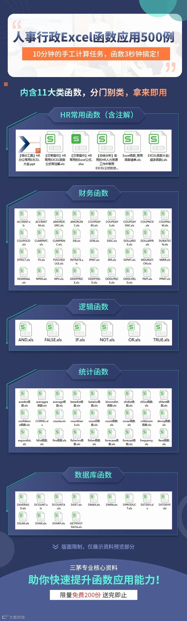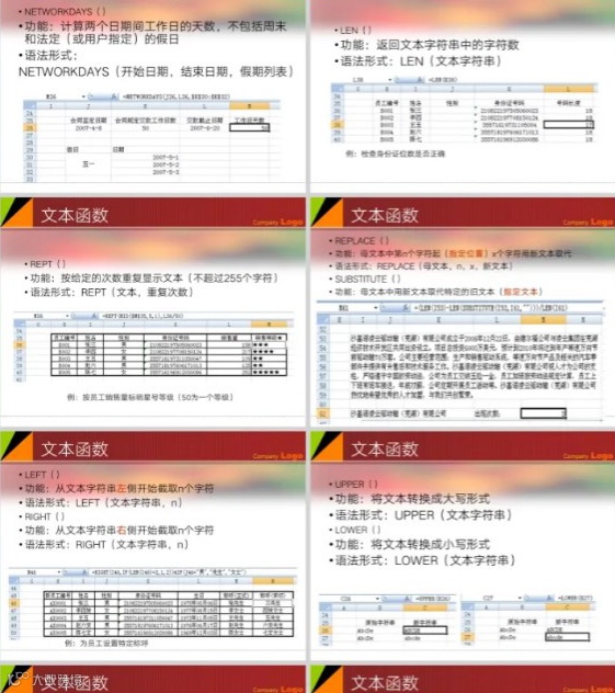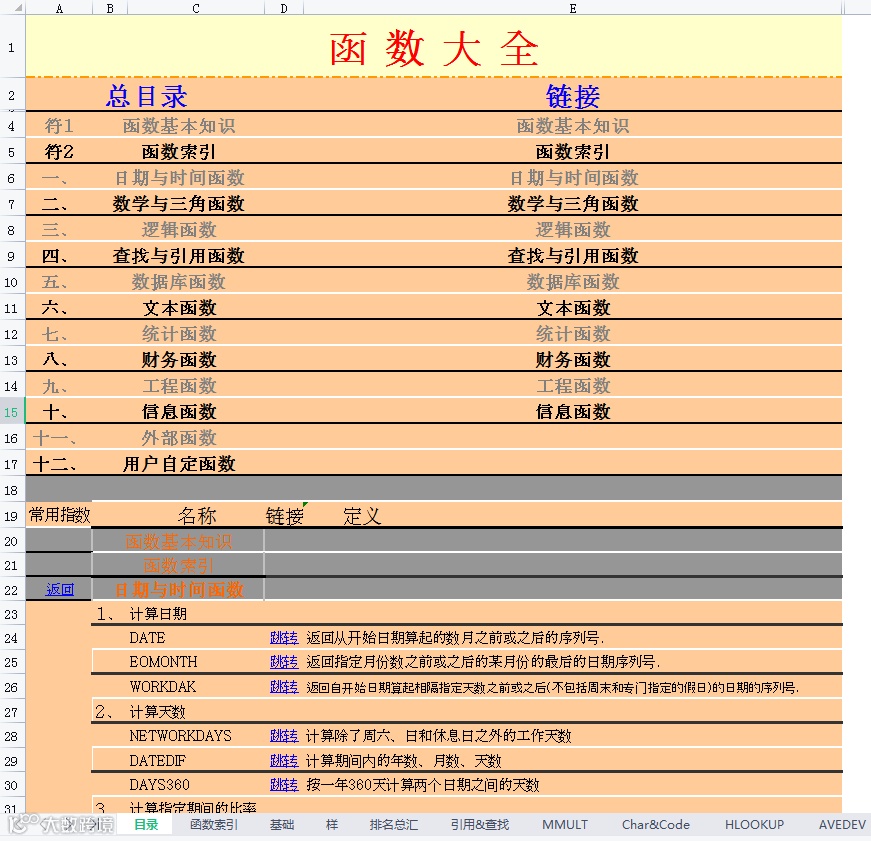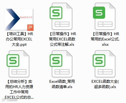 内含HR常用函数操作,财务函数,查找与引用函数,工程函数,逻辑函数,日期与实践函数,数据库函数,数学与三角函数,统计函数,文本函数,信息函数共11大类。