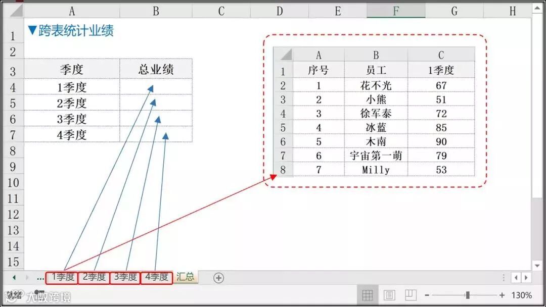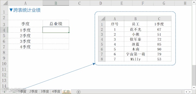 统计业绩时,如何让1-4季度的总业绩自动计算到汇总表?