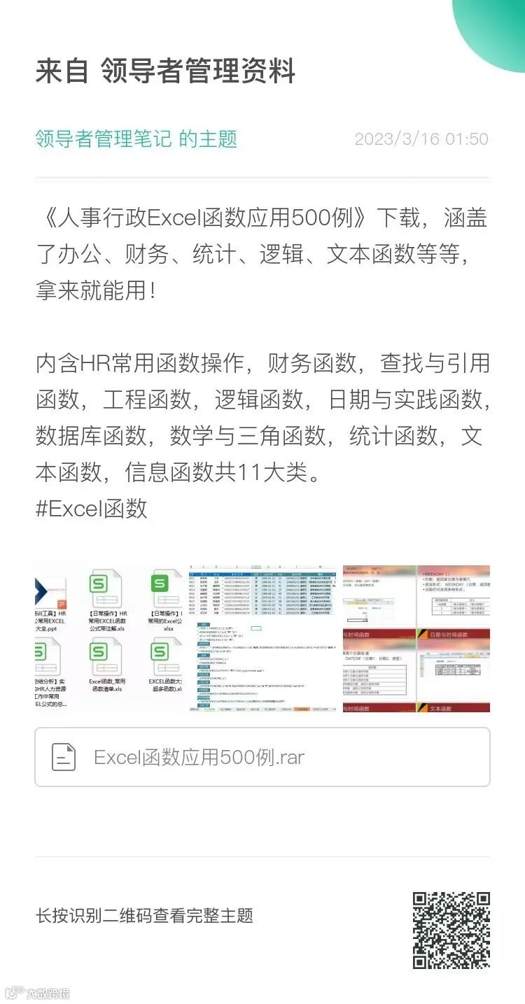 本期给大家带来《人事行政Excel函数应用500例》,涵盖了办公、财务、统计、逻辑、文本函数等等,拿来就能用!