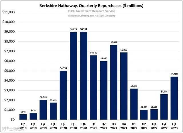 财报显示,伯克希尔的现金储备从去年四季度的1280美元增加逾20亿美元至1306亿美元,突破1300亿美元大关,创2021年底以来最高。公司还回购了44亿美元股票,显著高于去年底的28亿美元,并创2021年第一季度以来的最大回购金额,伯克希尔旗下公司回购了29亿美元股票。