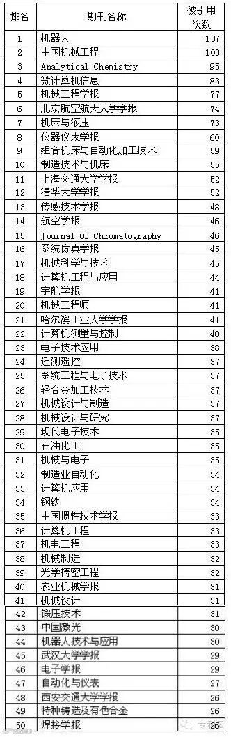 中国专利技术开发公司基于中国专利引文数据库,通过统计科学论文被高端装备产业中国专利引用情况,获得了对高端装备产业技术创新有重要影响的科技期刊数据,从中形成高端装备产业技术创新最受关注的50强科技期刊,以供实体产业在技术创新过程中参考借鉴。