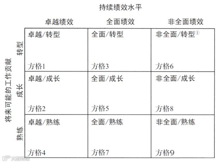 方格5:全面/成长 在此绩效提升是关键。如果能做出更好的成绩,这些人应该被委以所在层级中更重要的工作。