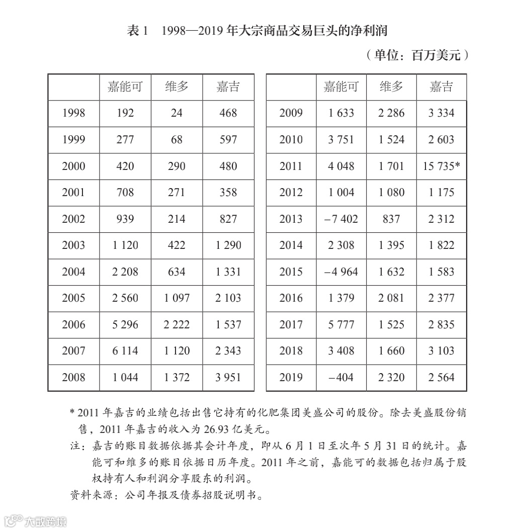 2019 年,五大大宗商品交易商的交易额达到 8 650 亿美元,超过了日本的出口总额。。马克·里奇公司在 1979 年的石油危机中赚取了丰厚的利润,应该可以列入美国十大营利性公司之一。在 2010年之前的 10 年,大宗商品交易一片繁荣,嘉能可、维多和嘉吉这三家大宗商品交易巨头的利润总和超过了苹果公司和可口可乐等全球知名商业巨头的利润总和。(见表1)