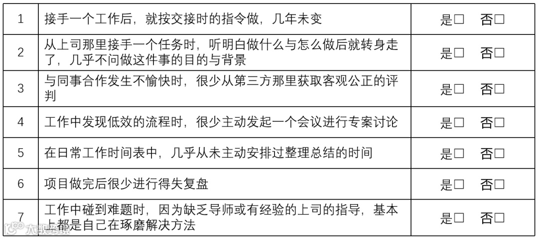 与刻意工作相反的是随意工作,随意工作就是不走心地工作,沿着前人的脚印,照着自己的理解,日复一日,年复一年地程序化工作。随意工作具备以下一些特征,读者朋友们不妨可以对照自测一下。