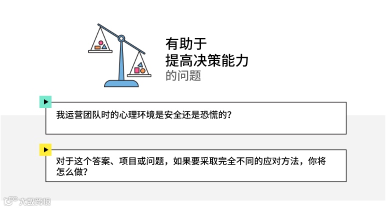 她还建议,在日常工作中都应该让自己有意识地回顾这些问题。“在参与某个需要我做出重要决策的会议之前,我都会在会议前专门预留五分钟时间,提醒自己要问这些问题。”她说。