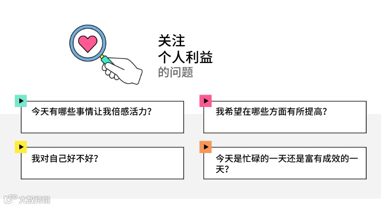 高管教练艾丽莎·科恩(Alisa Cohn)表示,“工作具有高强度和情绪化等特征。在面对多项任务的时候,你很容易陷入被动应对的模式。”对此,科恩建议,你应该养成良好习惯,每天都回顾一遍以下问题: