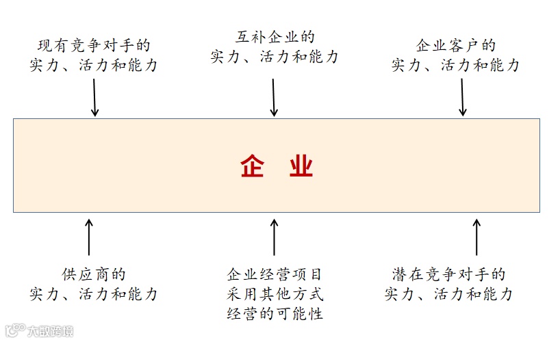 不过,上述分析仍为研究影响企业的因素提供了良好的方法。哈佛大学的迈克尔·波特(Michael Porter)教授提出了传统竞争力的各种因素,此作为讨论的出发点。波特认为影响企业竞争力的因素有5个。根据我的理解,它们是:
