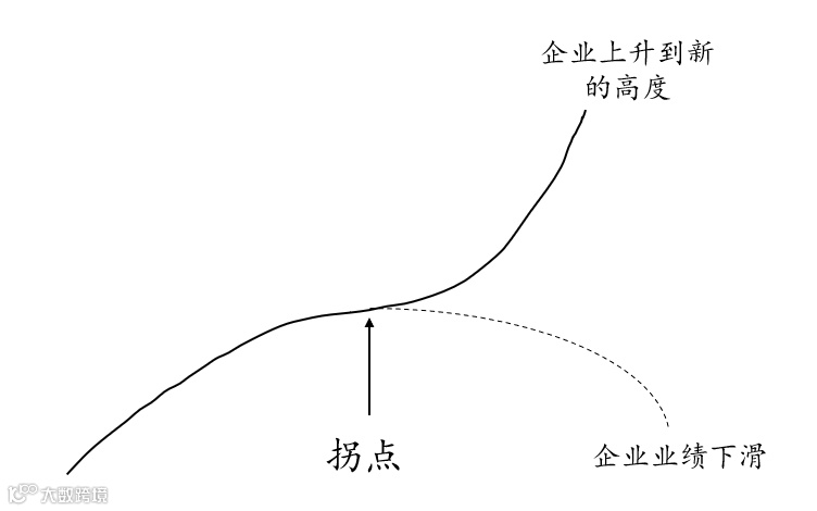 企业上的战略问题也是一样。在拐点上,旧的战略图被新的所替代,使企业能够上升到新的高度。但是,如果你不经历拐点(转折点),你的企业就会先上升到一个高峰,然后滑向低谷。转折点出现的时候,经营者迷惑不解地观察到,“形势不同了,有些东西发生了变化。”