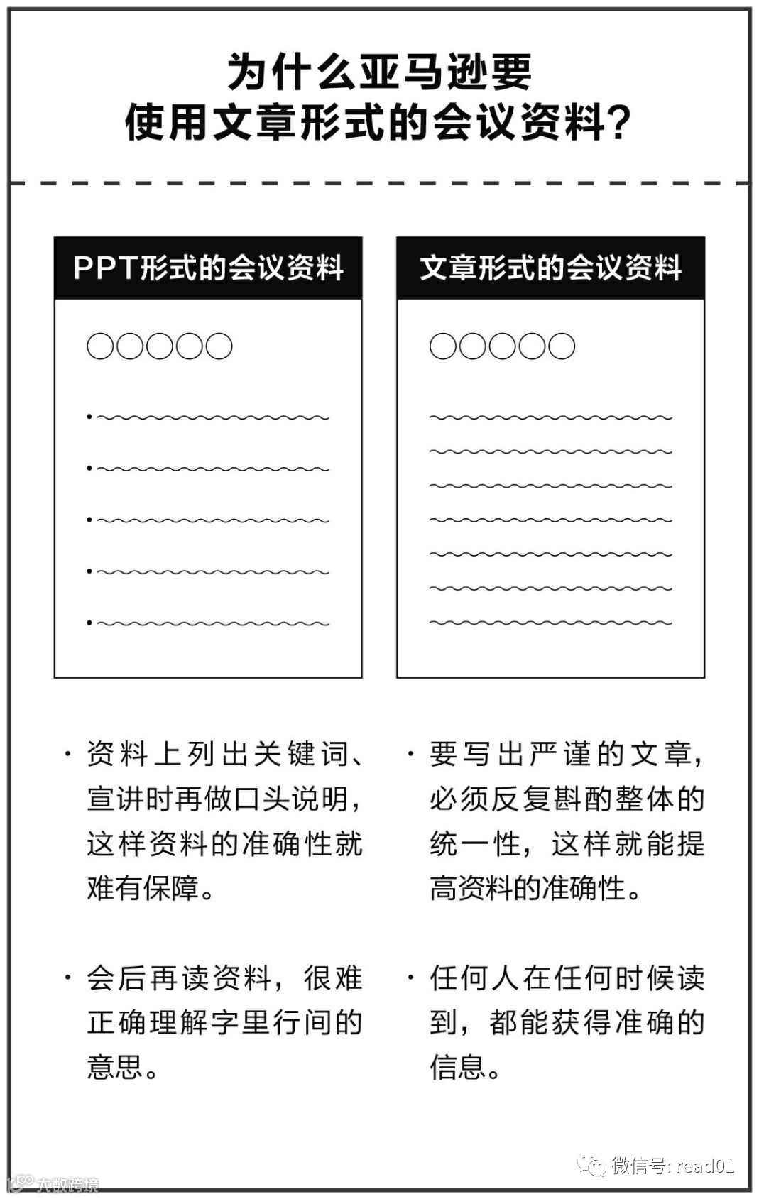 会议资料的内容比形式更重要。。“禁止使用PPT”的规定也正体现了贝佐斯的管理观点:公司不需要华而不实的东西。