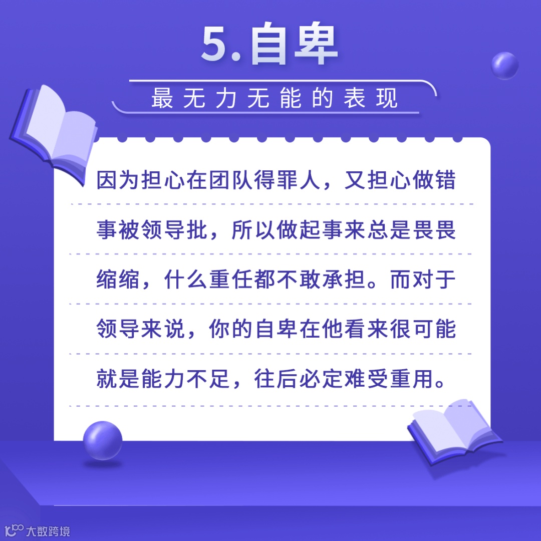 因为担心在团队得罪人,又担心做错事被领导批,所以做起事来总是畏畏缩缩,什么重任都不敢承担。而对于领导来说,你的自卑在他看来很可能就是能力不足,往后必定难受重用。
