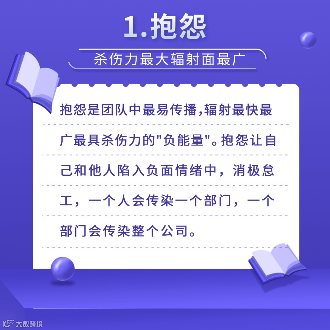 抱怨是团队中最易传播,辐射最快最广最具杀伤力的"负能量"。抱怨让自己和他人陷入负面情绪中,消极怠工,一个人会传染一个部门,一个部门会传染整个公司。