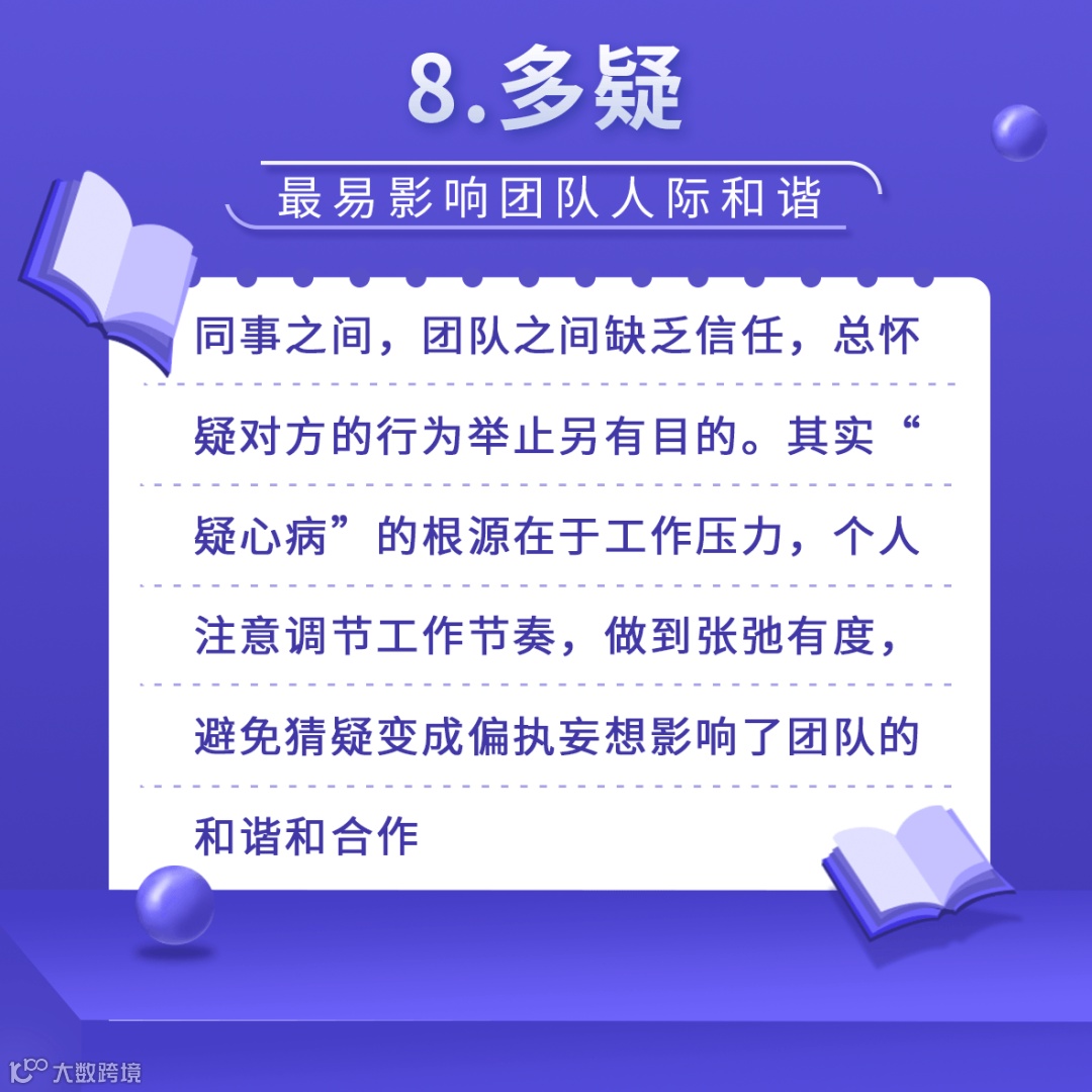 同事之间,团队之间缺乏信任,总怀疑对方的行为举止另有目的。其实“疑心病”的根源在于工作压力,个人注意调节工作节奏,做到张弛有度,避免猜疑变成偏执妄想影响了团队的和谐和合作。