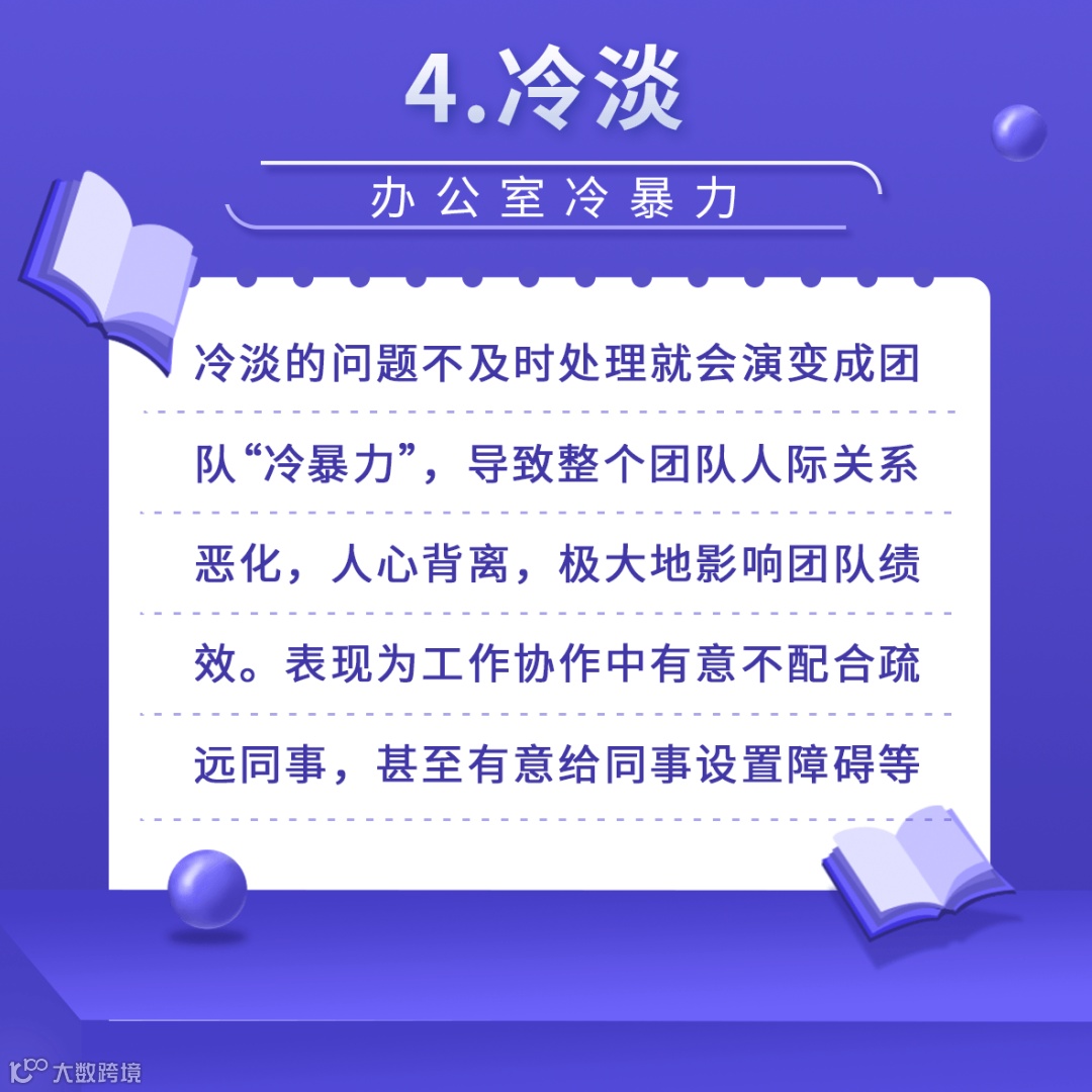 冷淡的问题不及时处理就会演变成团队“冷暴力”,导致整个团队人际关系恶化,人心背离,极大地影响团队绩效。表现为工作协作中有意不配合,疏远同事,甚至有意给同事设置障碍等。