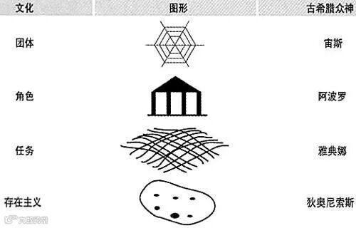阿波罗是希腊神话中的理性之神,代表秩序与法规。阿波罗代表的组织文化类型是角色文化,这种文化建立在逻辑和理性的基础上,结构像一座希腊神庙。