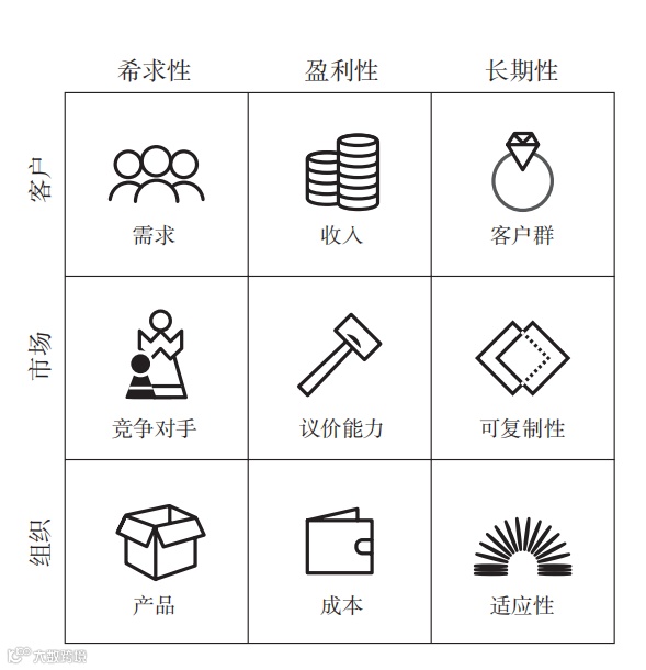 现在我们明确了三个目标:希求性、盈利性和长期性,以及三个不断变化的主体:客户、市场和组织。由于商业领域的一切都彼此联系,每一个主体都会影响每一个目标:比如,竞争中的改变会影响盈利,客户的改变会让产品的吸引力降低。