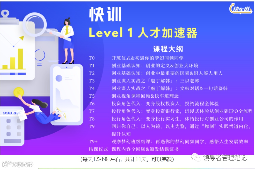 答:通常,快车道学员招募到30人即开新班;所以,你报名之后,只需要静候班主任/助教通知,提前拉你入群即可;学习时间为10-12天左右,每天45-100分钟,时间段和节奏都可以自由安排;学习方式为线上方式(快训自学习平台+微信班级群复盘互动+腾讯视频会议);快车道也鼓励学员线下小聚(AA制传统)。