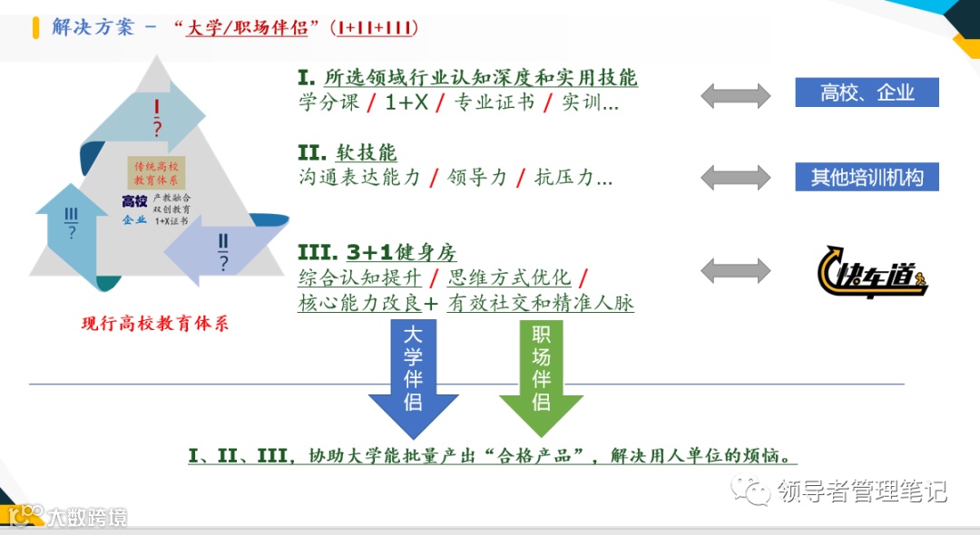 下图,可以从某个侧面,讲述快车道的“与众不同”——因为它要试图从更为底层的“认知、思维、能力”层面,去充当好高校和大学生朋友们的“大学伴侣”和职场人士的“职场伴侣”这个角色,一是填补该类市场之空白,二是甘愿去啃硬骨头。这既需要勇气,更需要智慧。