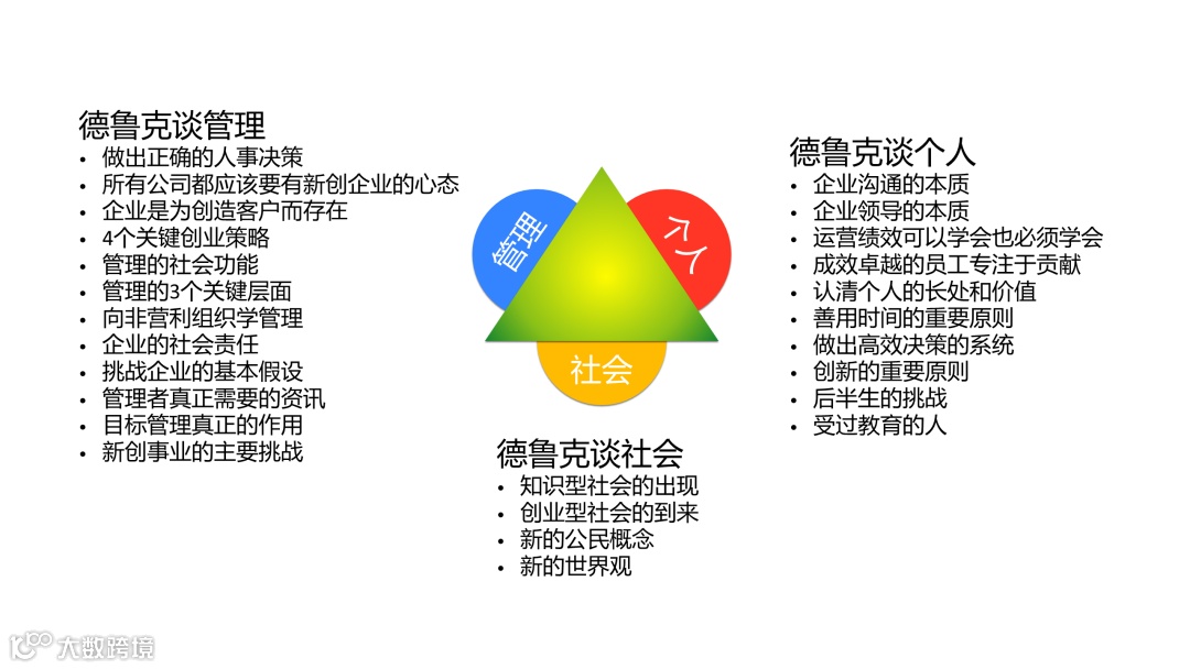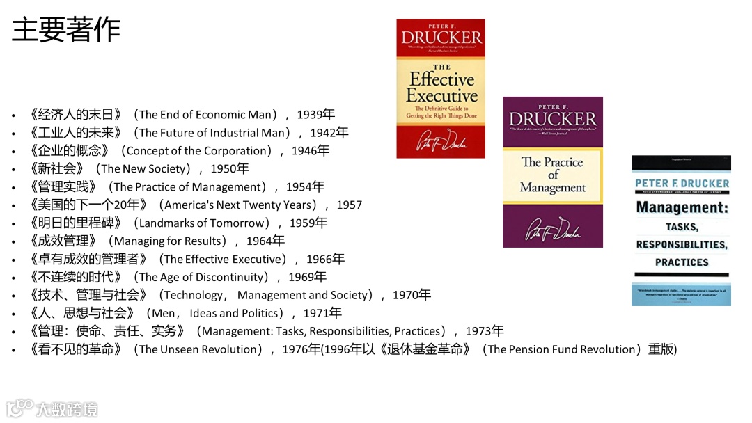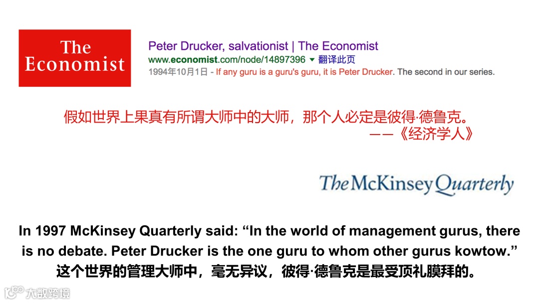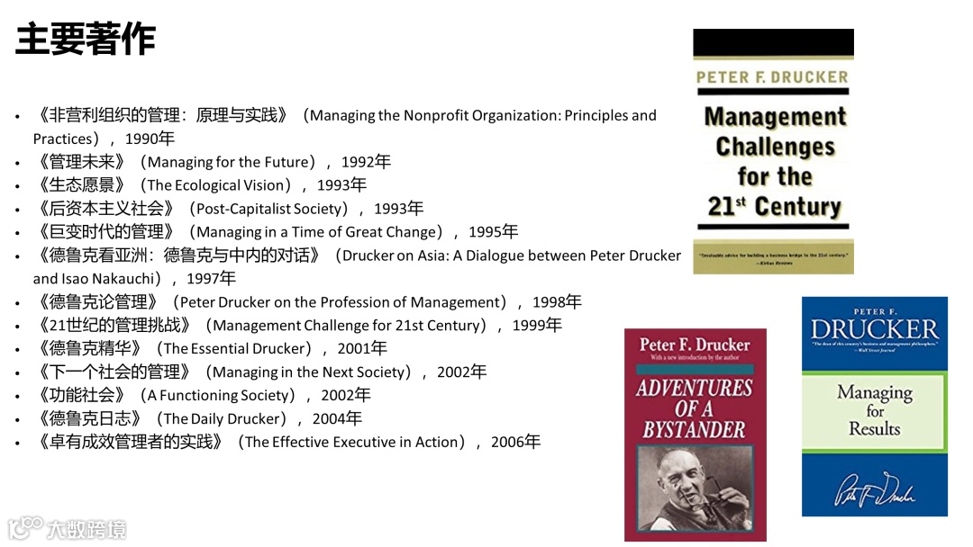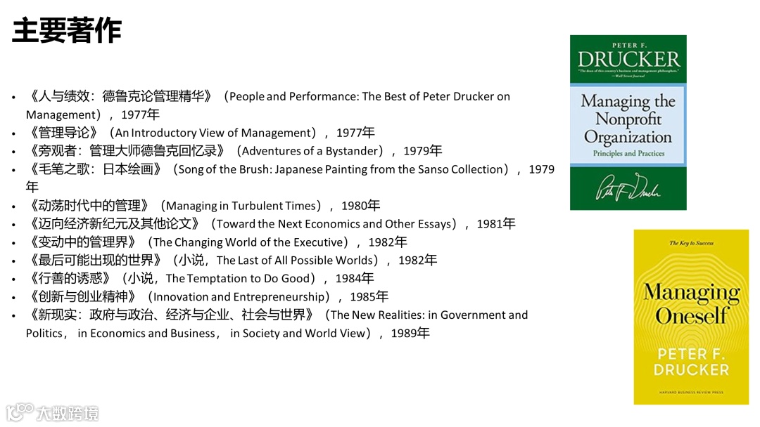 ►领导者说:★彼得·德鲁克(Peter F. Drucker),现代管理学之父,其著作影响了数代追求创新以及最佳管理实践的学者和企业家们,各类商业管理课程也都深受彼得·德鲁克思想的影响。德鲁克至今已出版超过30本书籍,被翻译成30多种文字,传播及130多个国家。