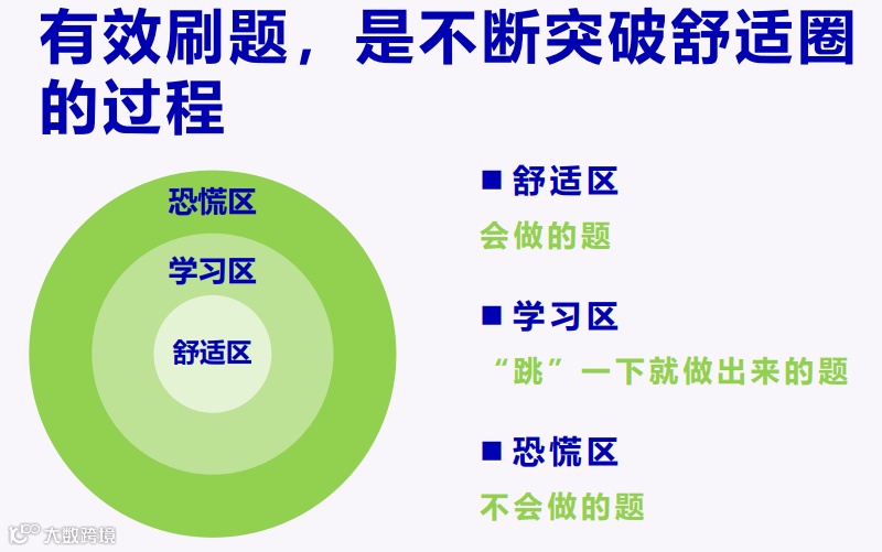 刷题的过程,其实就是不断突破自己舒适区的过程,你要刷的题,一定是超出自己舒适区的题,但又不能超出舒适区太多,超出太多就会太难,你完全做不出来也没有意义。