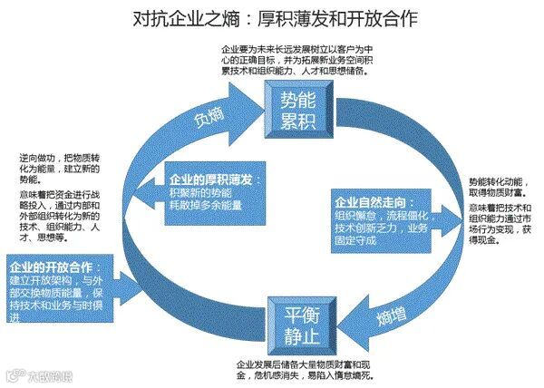 在华为宏观活力引擎模型上,开放合作与厚积薄发成为打造负熵流的主要方法,通过逆向做功,一方面消耗了多余的物质财富,打破平衡静止,避免物质财富过多导致的熵增,另一方面又建立起新的企业发展势能,为长远发展积聚能量。