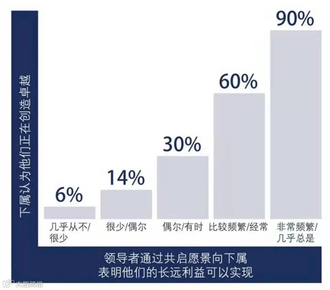 数据表明,那些被直接下属评价经常或几乎总是向人们共启愿景的领导者相较于那些很少共启愿景的领导者,在实现组织的长期利益方面高出16倍。向人们强调“为什么”,比如“为什么我们要这么做,为什么这件事情重要?”, “这就激活了人的大脑奖励系统,它不仅提高了人们的努力程度,而且增强了他们对自己正在做的事情的认同”。