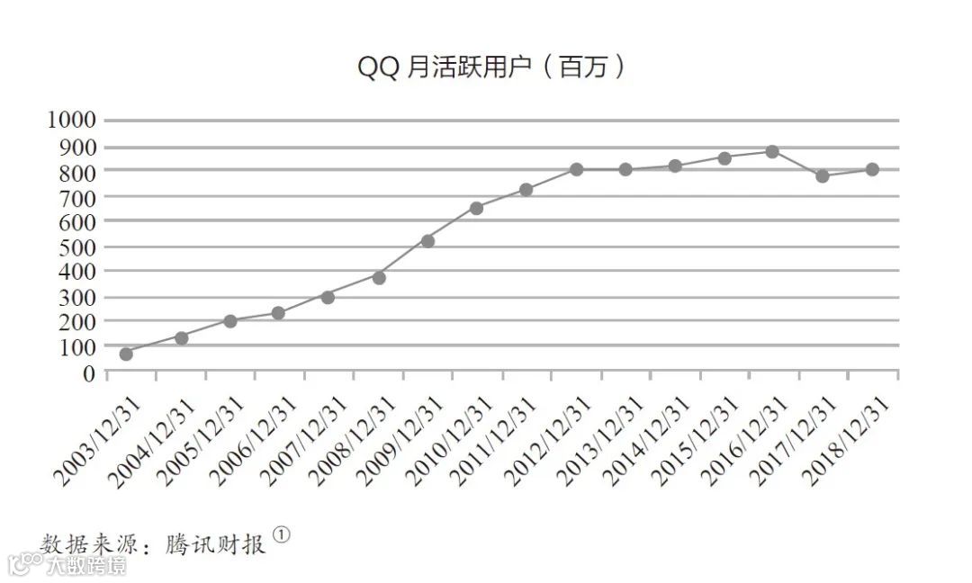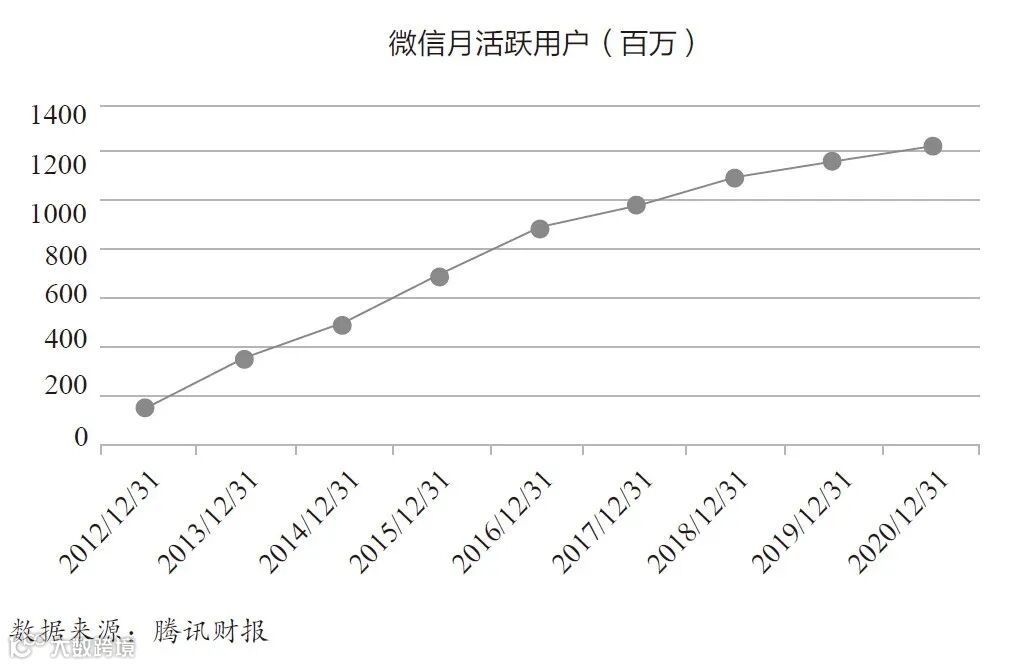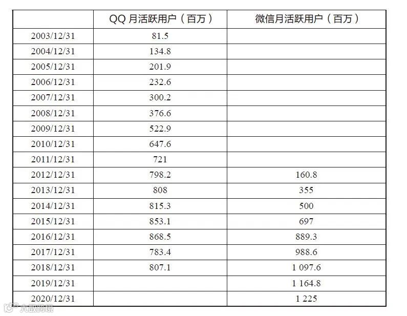 不难看出,2016年是QQ和微信用户活跃用户数量大小发生变化的分界线,从2016年年底开始,微信超越QQ继续向上突破。