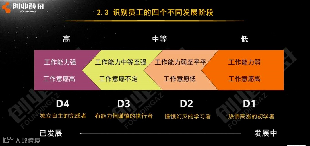 这时她处于D3阶段,支持式的管理风格比较好。这时候,我找了团队中另外一个同学,他的能力不是特别强,但非常有意愿。这时候我想把他培养出来,抓一个榜样,别人见到他的变化后,也会信任我。