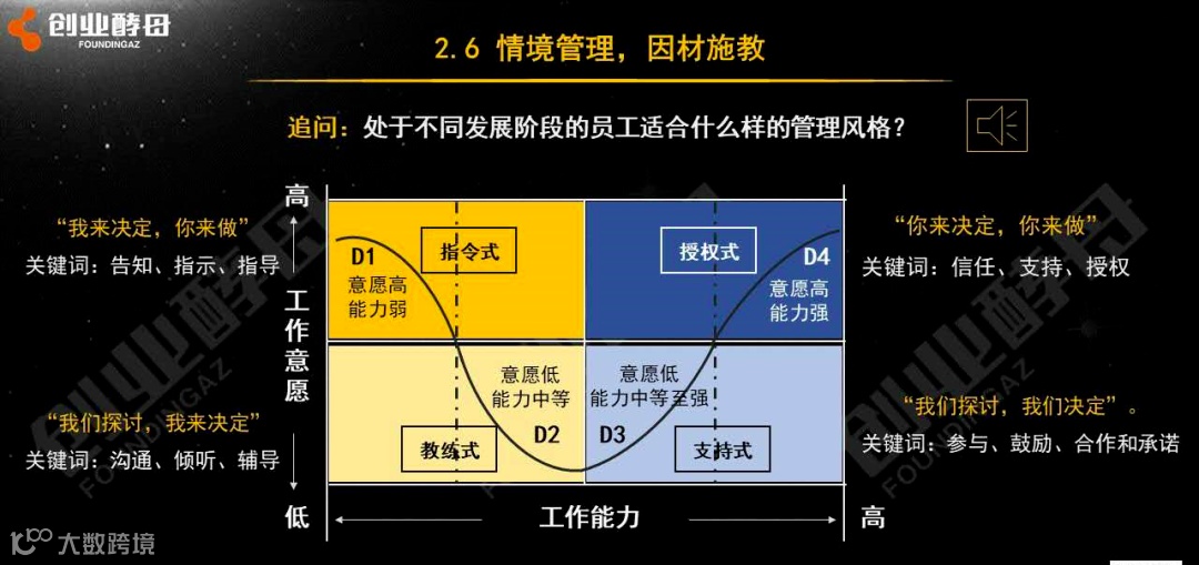 教练式的管理风格,更适合用在处于D2阶段的员工身上。“我们探讨,我决定”,当员工处于憧憬幻灭时,意愿低,能力低,要倾听他的心声,然后鼓励他,并且帮助他做决定。