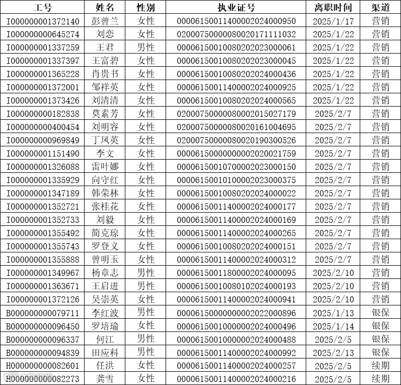 本次公示离职人员包含营销渠道22人,银保渠道4人,续期渠道2人,共计28人。公示的信息包含离职人员工号,姓名、性别、执业证号码以及离职时间。