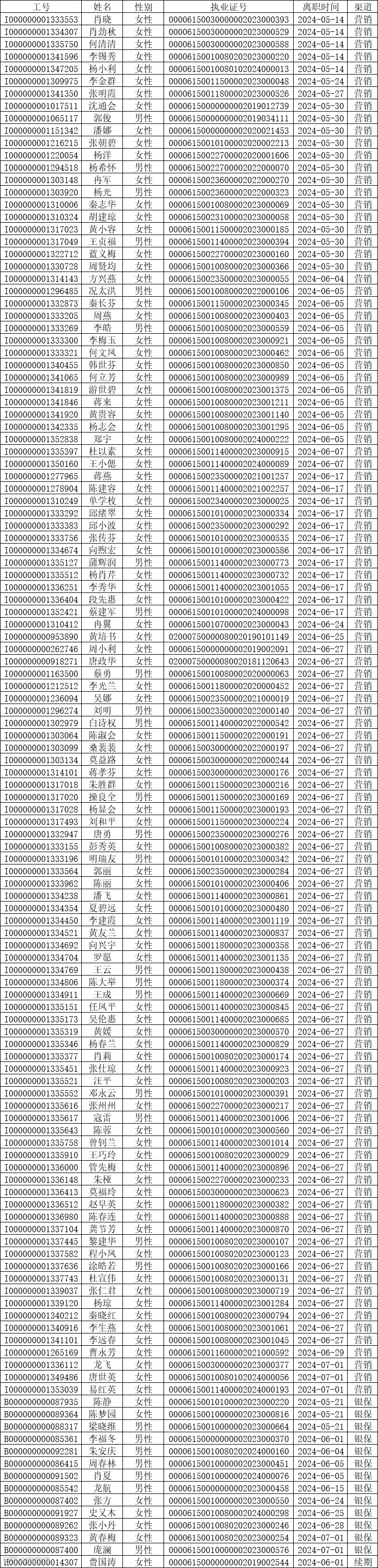 本次公示离职人员包含营销渠道112人,银保渠道13人,续期渠道1人,共计126人。公示的信息包含离职人员工号,姓名、性别、执业证号码以及离职时间。