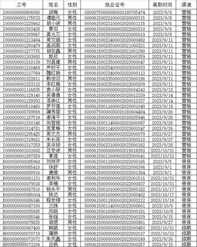 本次公示离职人员包含营销渠道27人,银保渠道12人,续期渠道4人,共计43人。公示的信息包含离职人员工号,姓名、性别、执业证号码以及离职时间。