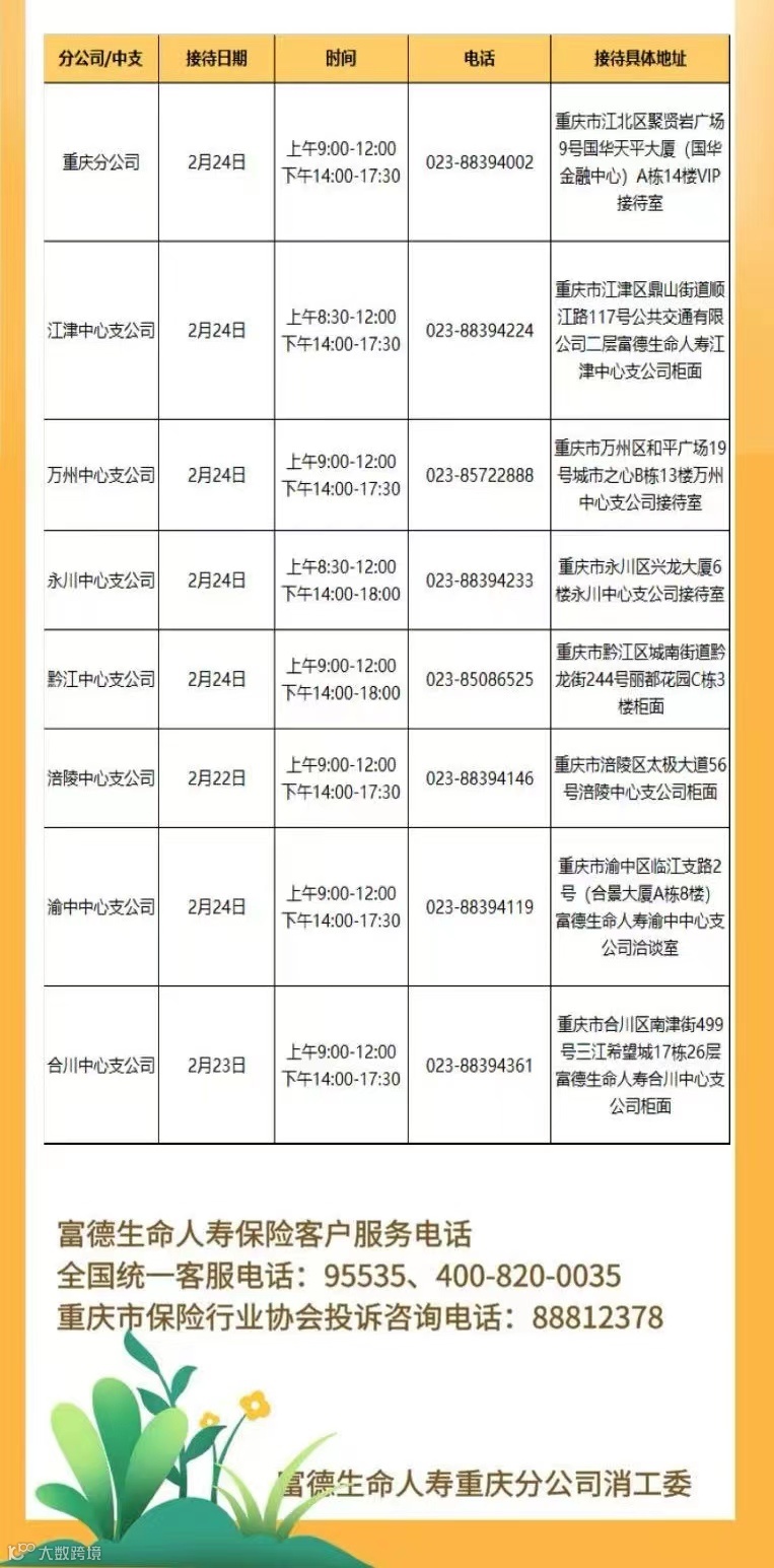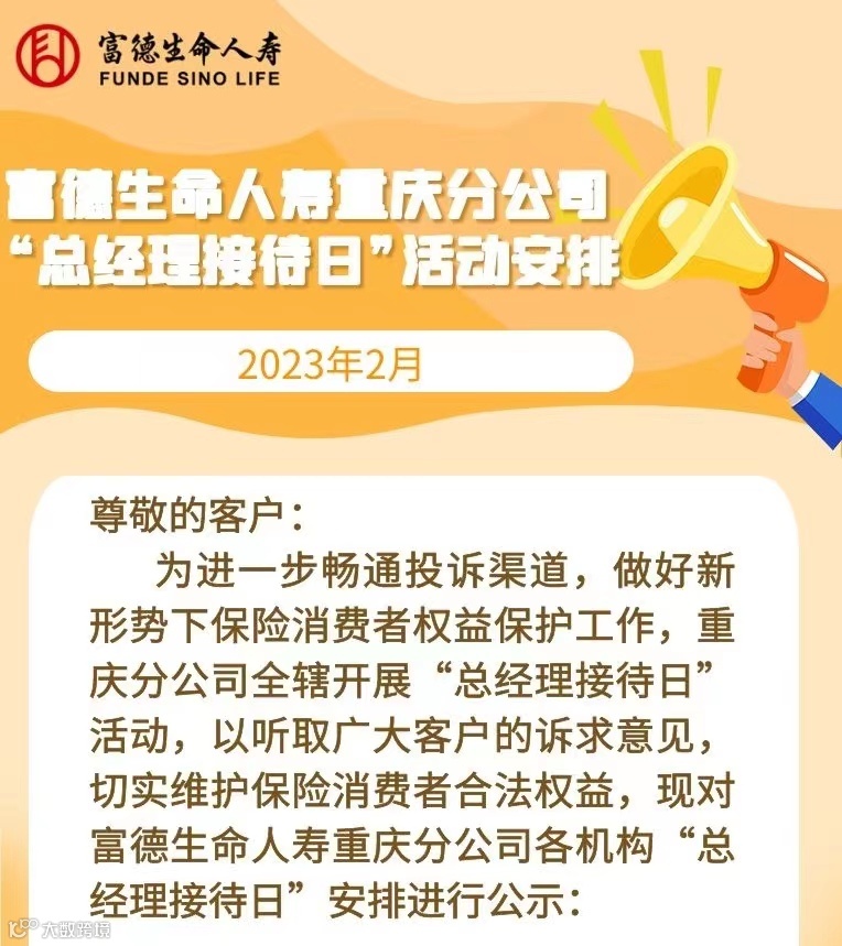 富德生命人寿重庆分公司2月“总经理接待日”活动安排