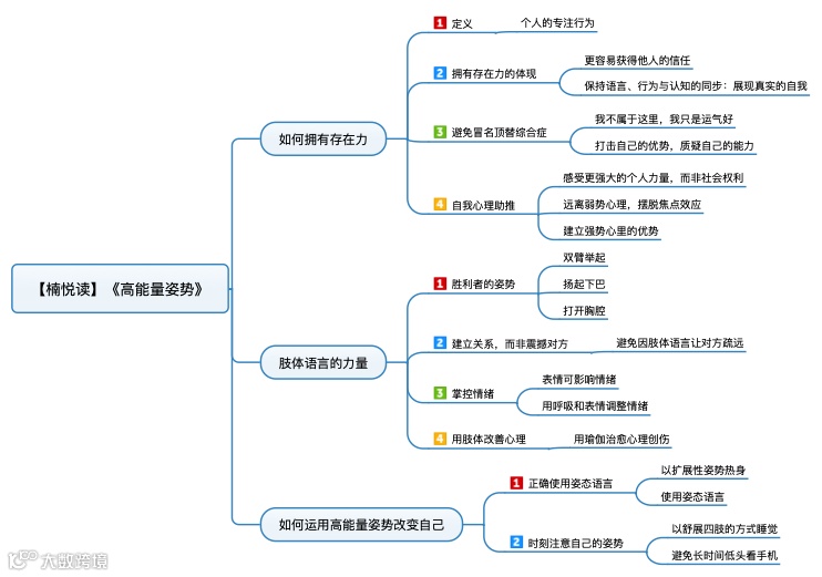 处于存在的状态的人们,会表现出各种吸引人的特质:热情、平和、表里如一、值得信任、自信而不自负等等。存在力可以通过自我助推,逐步调整肢体语言和心态,即通过自我引导来获得。从某种程度上来讲,这是让你的身体来引导你的想法。