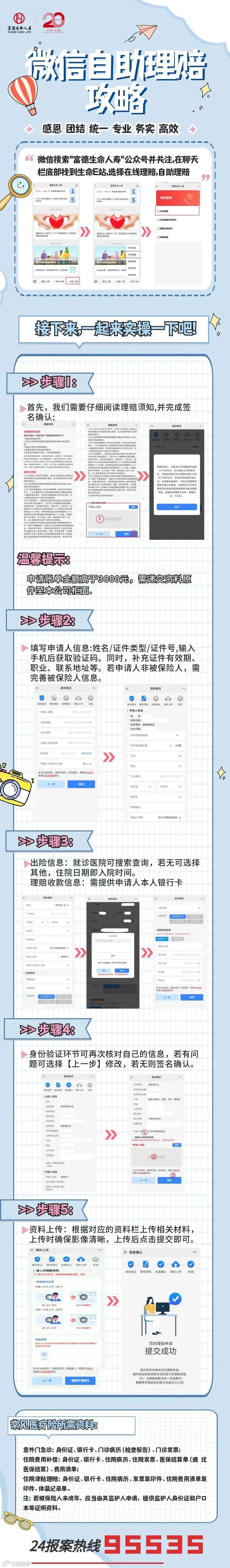 关注“富德生命人寿在线”微信公众号(S95535),选择生命E站,进行在线理赔、自助理赔。