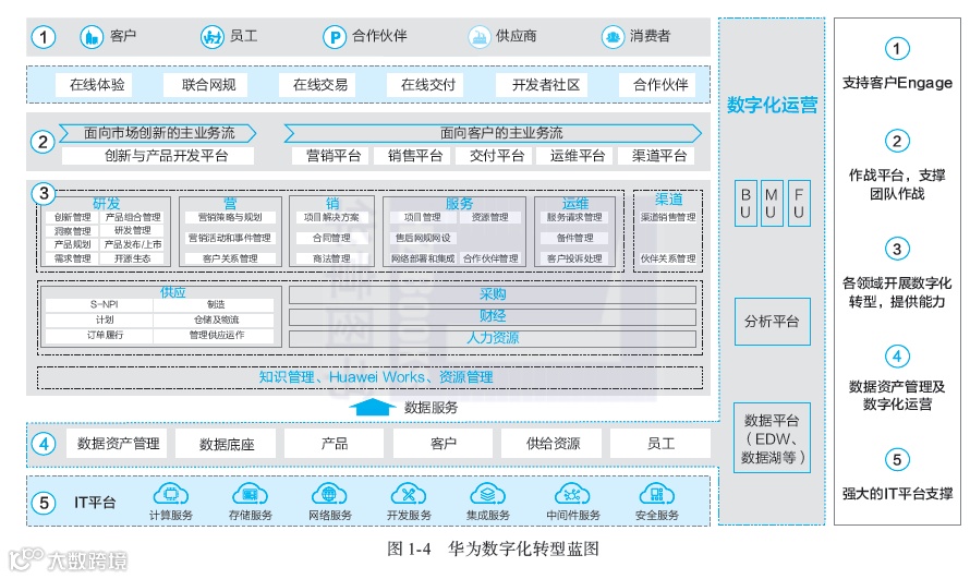 2017年,华为基于愿景确定了数字化转型的蓝图和框架,统一规划、分层次开展,最终实现客户交互方式的转变,实现内部运营效率和效益的提升。华为数字化转型蓝图包括5项举措(如图1-4所示)。