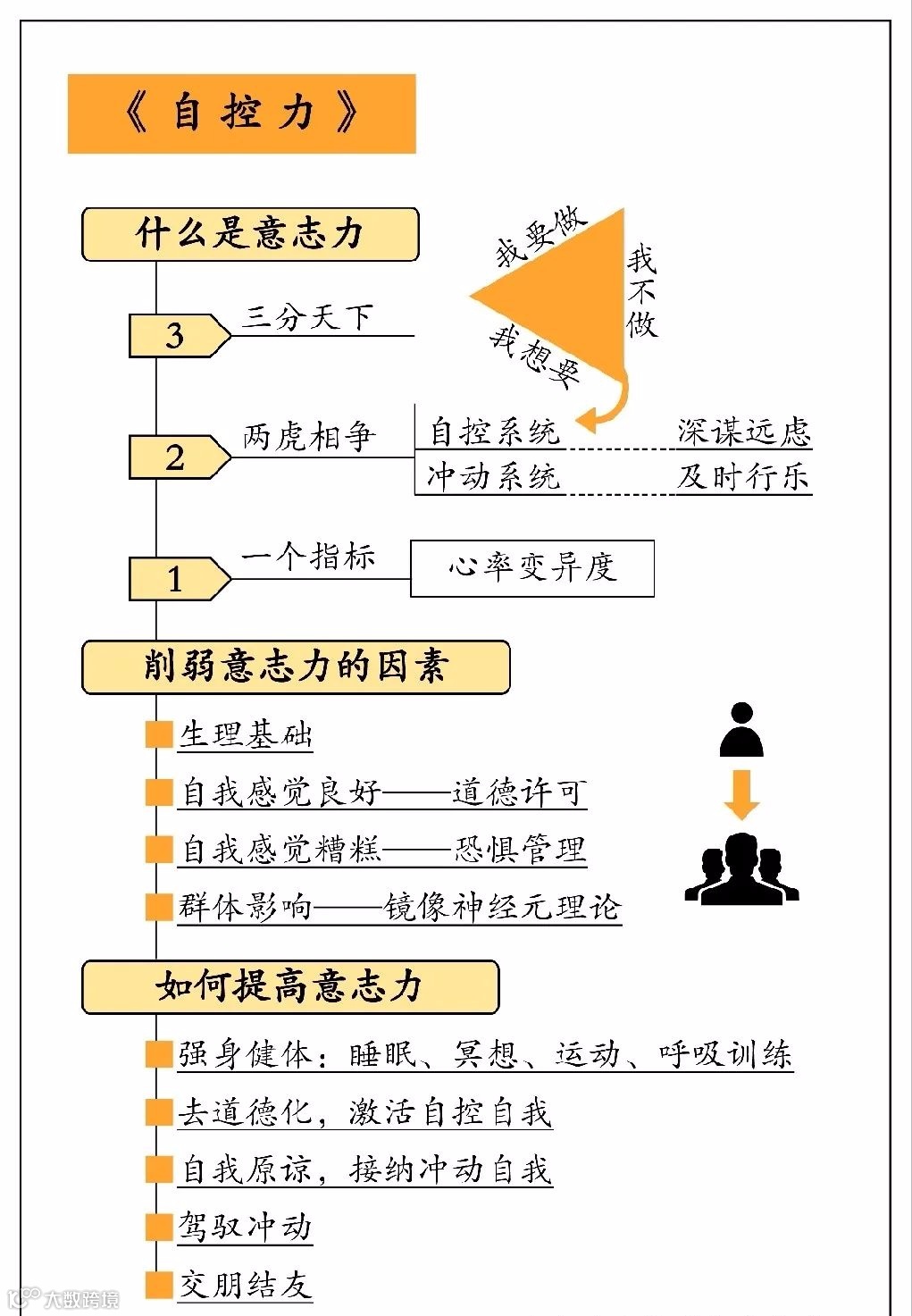 然后,我们又说了削弱意志力的主要因素有四个,它们是生理基础,自我感觉良好,自我感觉糟糕,以及群体影响。