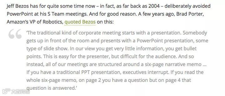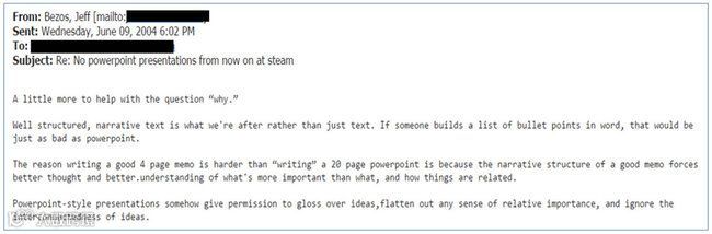 这封贝索斯的邮件正式取缔了亚马逊使用PPT的做法,并强调带着想法来开会的人必须以 "结构化的叙述 "来呈现。