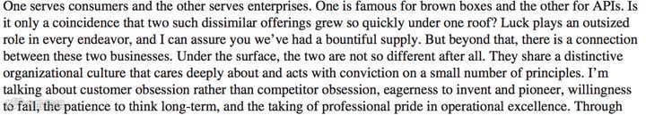 例如,在2015年致股东信的引言部分,他问道:"两个如此不同的产品(指亚马逊电子商务和亚马逊的云服务)在同一个屋檐下发展得如此迅速,这只是一个巧合吗?" 通过这样的反问,贝索斯证明了他对这个问题进行了深入的思考,以及对企业的未来充满信心。