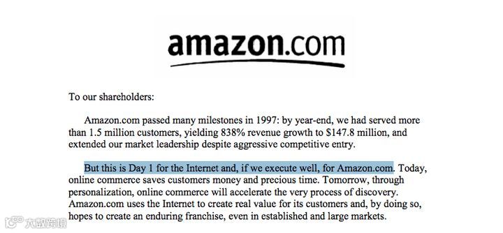 Day 1的比喻最早出现在贝索斯给股东的公开信中,现在在亚马逊内部的影响力非常大,贝佐斯将亚马逊西雅图新总部也命名为 "Day 1"。
