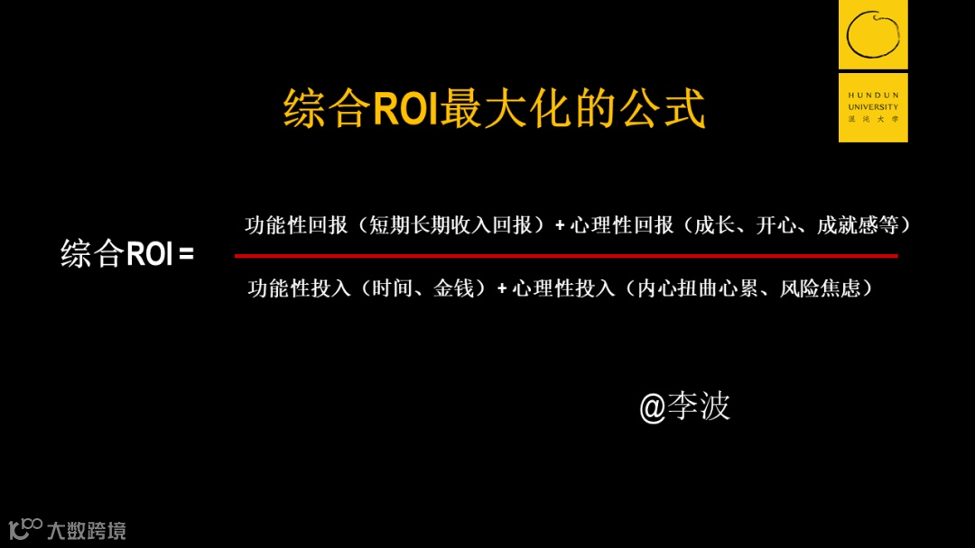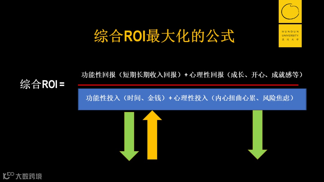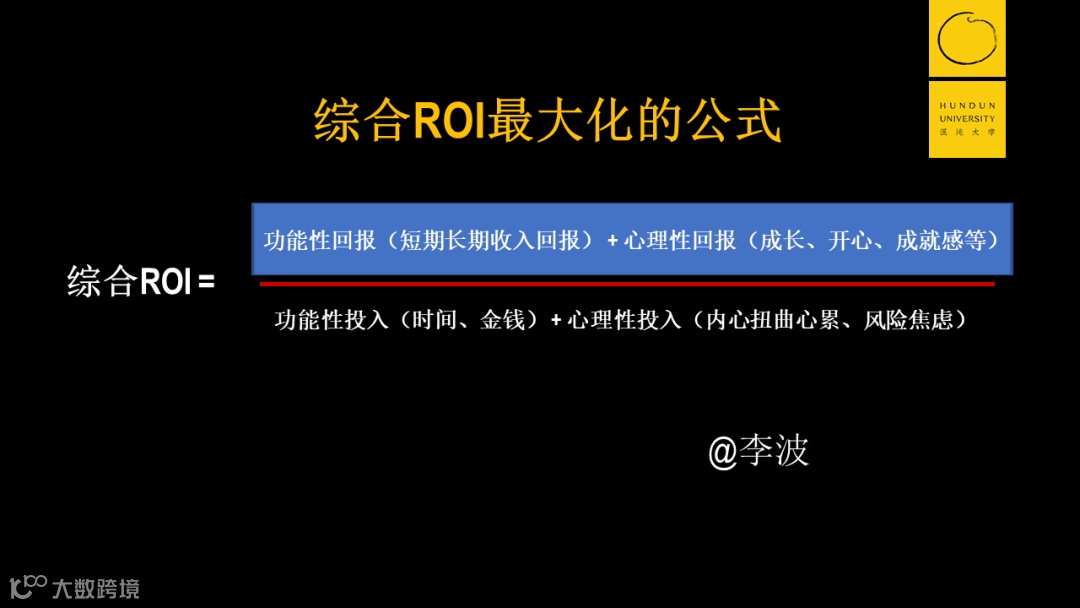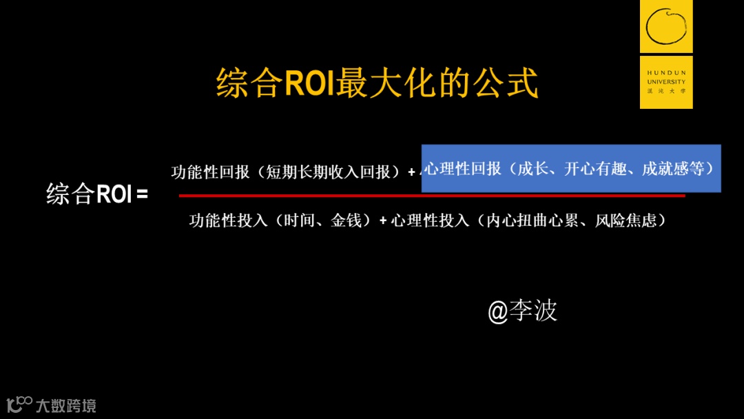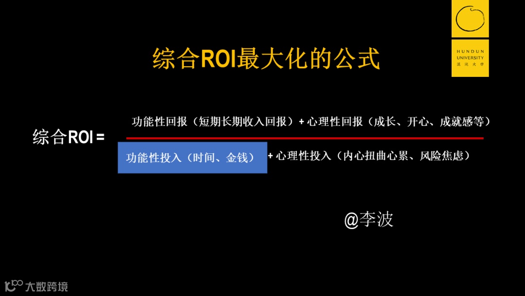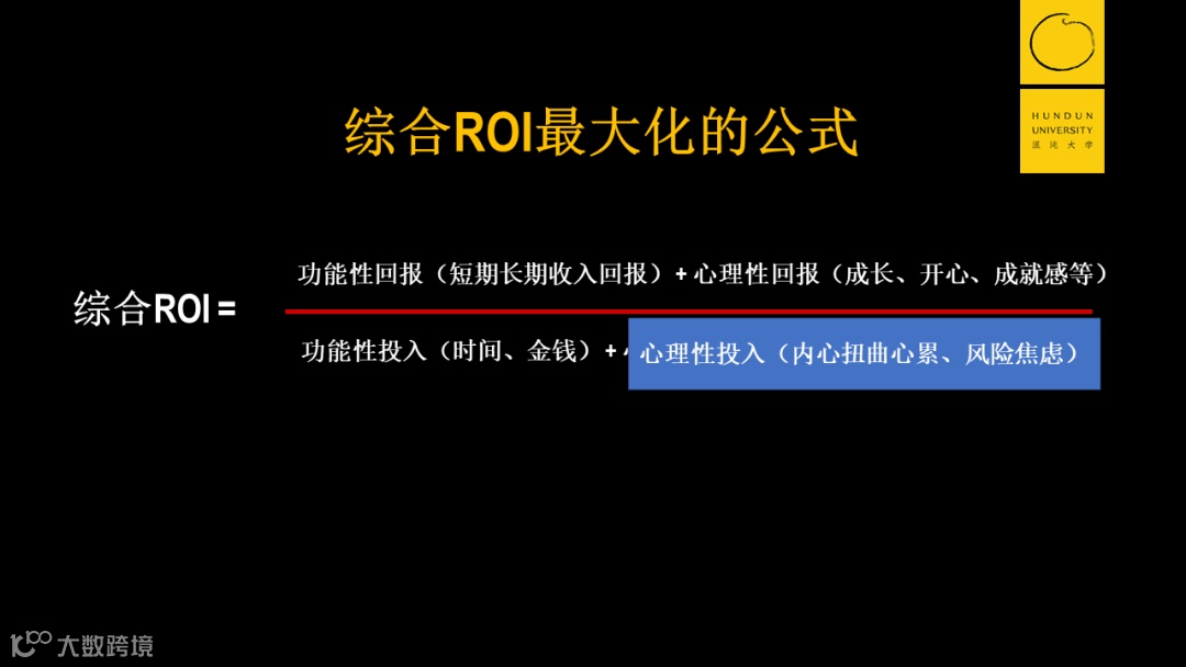 它的大小主要由四个元素来决定,分别是公式的分母端的功能性投入(投入的时间、金钱)加上心理性投入(内心疲惫、精神焦虑);分子端的功能性回报(长短期收入)加上心理性回报(开心、成就感、成长)。