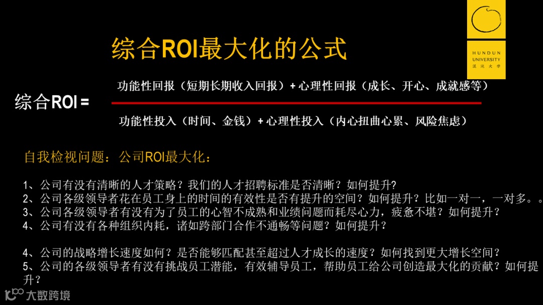 对于员工来说也是一样,他为什么愿意加入你的公司,因为加入你的公司,个人投资回报率最大。
