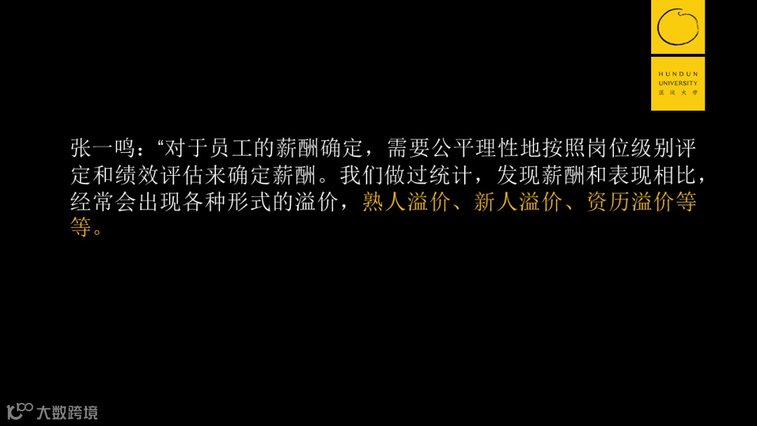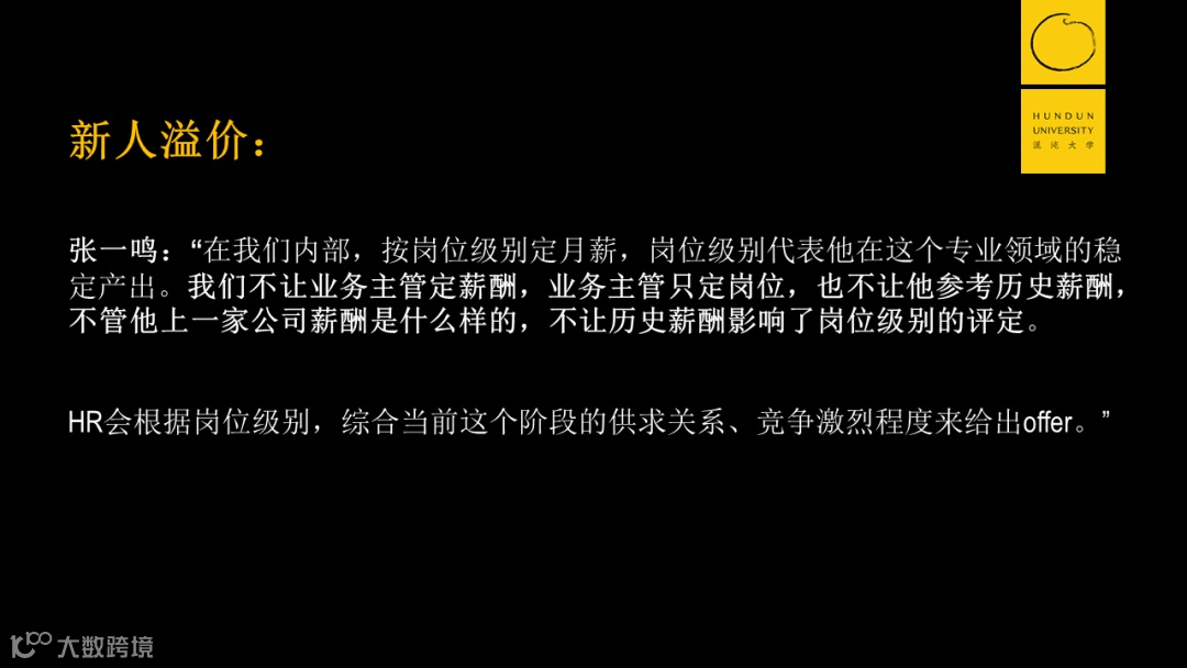 比如新人溢价。这个人跳槽过来,那我们怎么着得在他原来的工资水平上做一定的涨幅。但偏高的工资,很可能对原有团队里面快速成长的人产生不公平的对比。