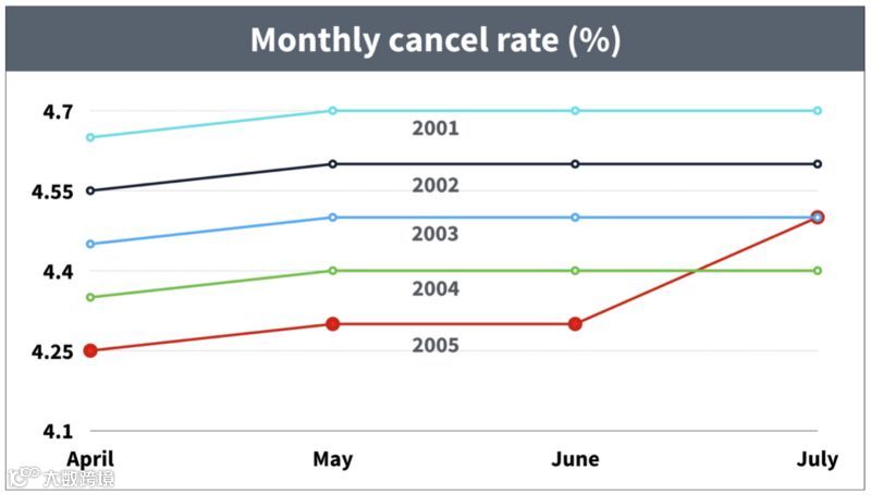 2001-2005年Netflix的月度订阅取消率变化如下: