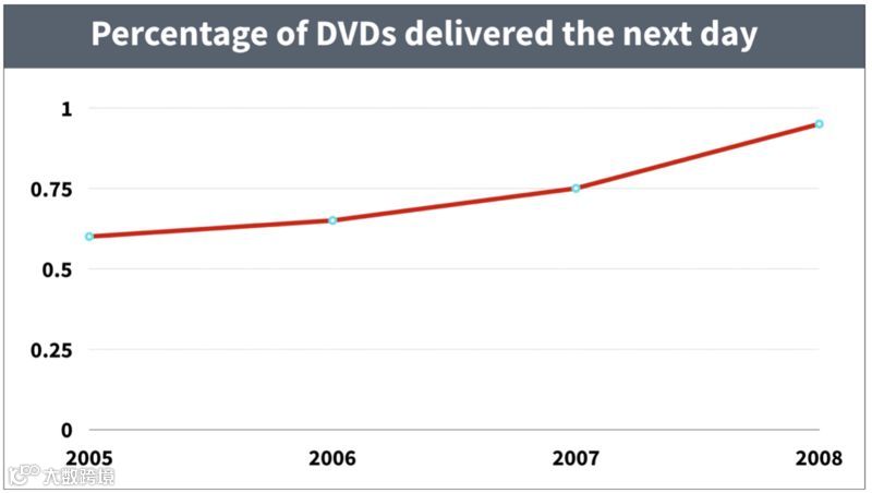 在此基础上,我们提出了一个假设,即更高效的DVD送货效率将有助于保留客户,并将次日DVD交付作为我们的持续指标之一。在接下来的几年里,我们的运营团队将DVD自动发货系统从20个仓库扩展到100个仓库,并将库存系统与网站销售系统连接起来,只在用户的个人账户中显示可次日送达的DVD资源。