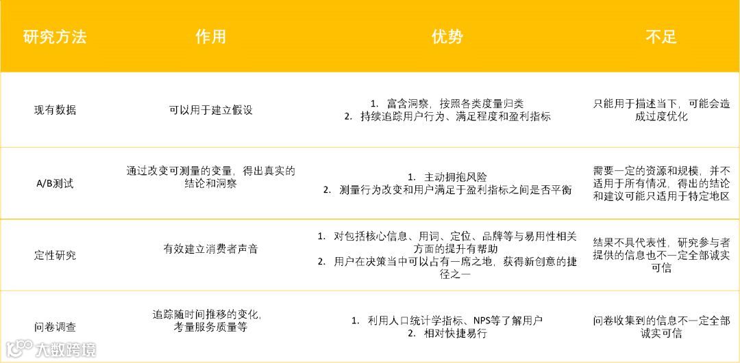 比如,现有的数据只能用来描述现在而不是未来的情况,用户有时会因为各种原因在问卷调查或焦点访谈中说谎,而且不是所有的东西都可以进行A/B测试。