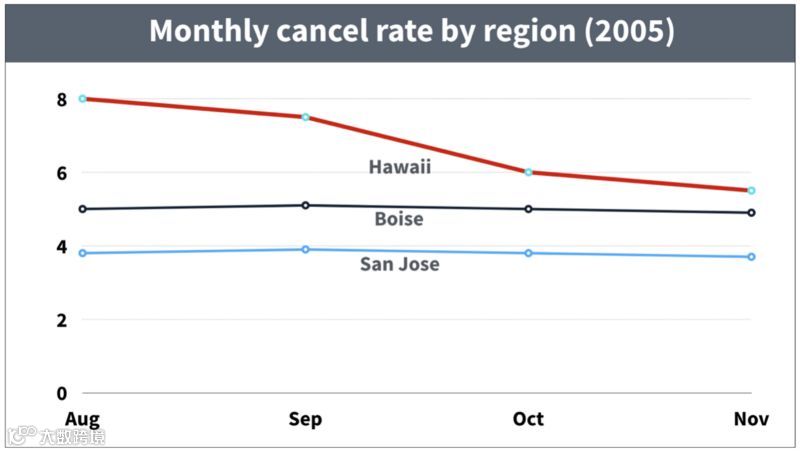 而在分析地区数据时,我们发现夏威夷的订阅取消率从9月开始明显下降。夏威夷、圣何塞和博伊西的月度订阅取消率大致如下: