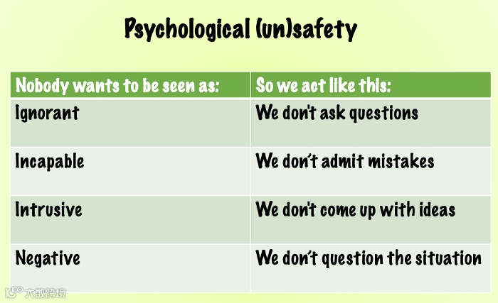 心理安全听起来很简单,但如果作为团队成员,你会问一个简单的问题,比如 "这个心理安全的目的是什么?"。听起来就像是你不明白一样,那么就容易不问清楚,避免给人留下无知的印象。没有人愿意给人无知、无能、咄咄逼人或消极的印象。