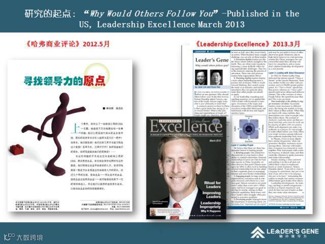 这些研究最后总结形成了一些文章,有一篇文章是我们2012年5月,在《哈佛商业评论》发表的一篇文章,从下面这张图中大家可以看到,一篇文章叫《寻找领导力的原点》,这是其中的一个研究。后来在2013年的3月,我们在美国顶尖的一个领导力专业期刊,叫《Leadership Excellence》这么一个杂志上面,也发表了一篇来自中国的文章,叫Leader’s Gene,我们也尝试建立一种模型,来说明这种领导力到底是来自于什么地方?
