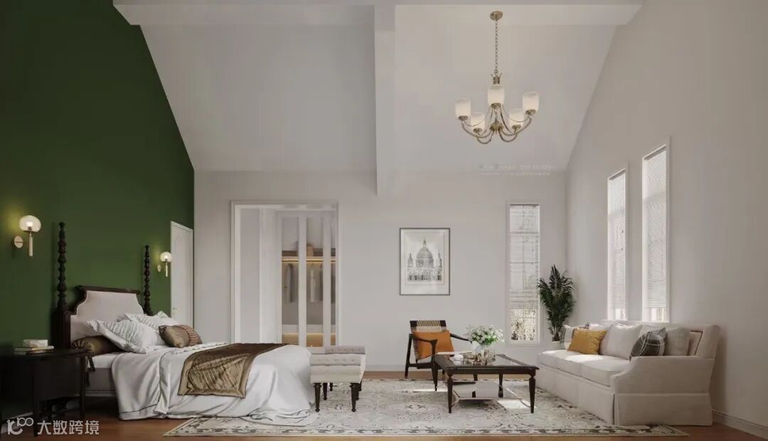 墙面采用奶油色墙漆为主基调,背景墙大胆选用牛油果绿拼接,富有艺术感的复古吊灯,再搭配一张毛绒地毯,油画质感的自由浪漫扑面而来。